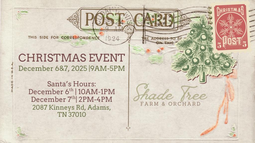 Kick off the holiday season with Christmas at Shade Tree, happening December 6–7, 2025! Bring the whole family out to the orchard for a weekend