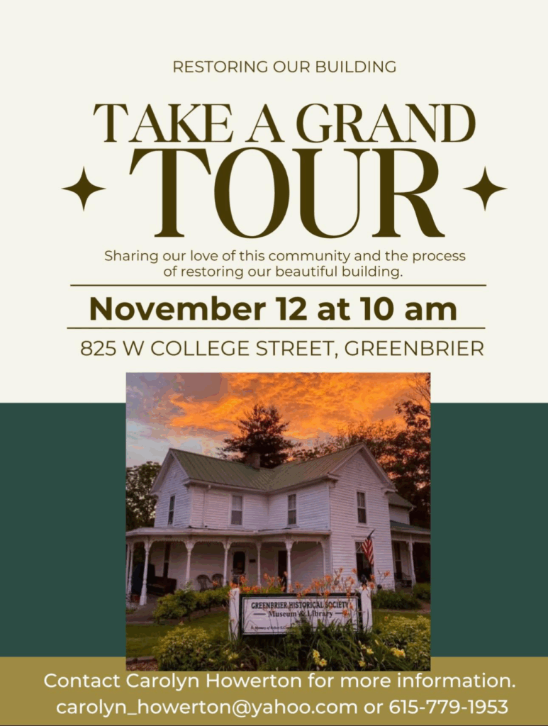 12nov10:00 pm4:00 pmGreenbrier Historical Society - Grand TourJoin us for a special behind-the-scenes tour as we restore one of Greenbrier’s historic treasures.