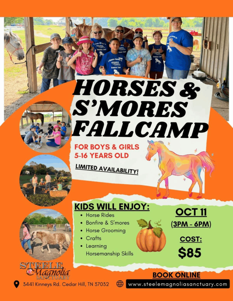 11oct3:00 pm6:00 pmSteele Magnolia Sanctuary - Horses & S'mores Fall CampAn unforgettable fall afternoon of horses, crafts, and s’mores for kids ages 5–16 at Steele Magnolia Sanctuary.