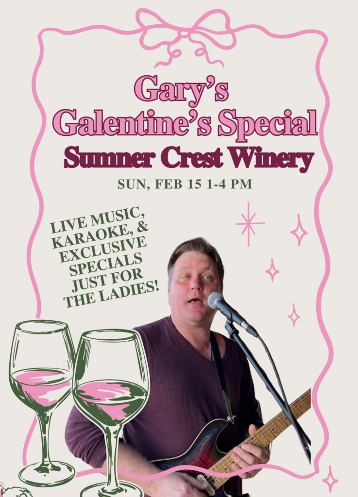 Grab your best girlfriends and head to Sumner Crest Winery for Galentine’s with Gary—a ladies-only afternoon filled with wine, music, laughter, and unforgettable moments.